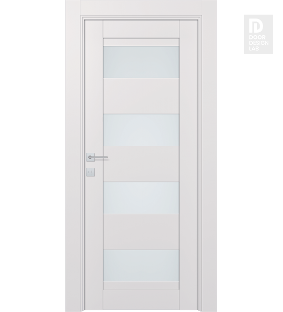 Modern design: eco-friendly materials, straight lines, and glass panels are the hallmarks of the door in a classic style with hi-tech highlights. The minimalistic design of the slab will fit harmoniously into every room. This door features four frosted white glass inserts and three rails stacked in Shaker style. Thanks to the noble shade, Avon 07-08 Vetro will refresh your interior and become an accent piece of your home or apartment.
