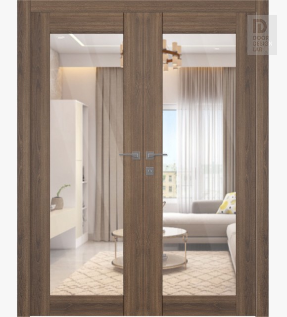 Avon 207 Clear Vetro Pecan Nutwood Modern Interior Double Swing Doors by Belldinni