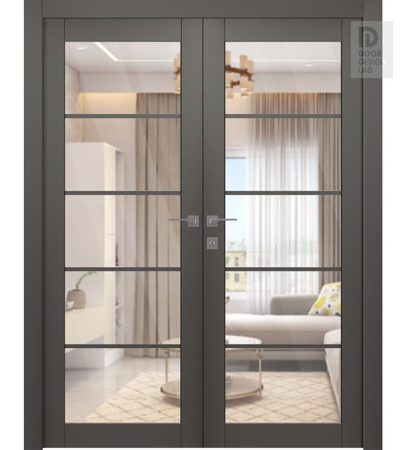 Avon 5 Lite Clear Vetro Gray Matte Modern Interior Double Swing Doors by Belldinni
