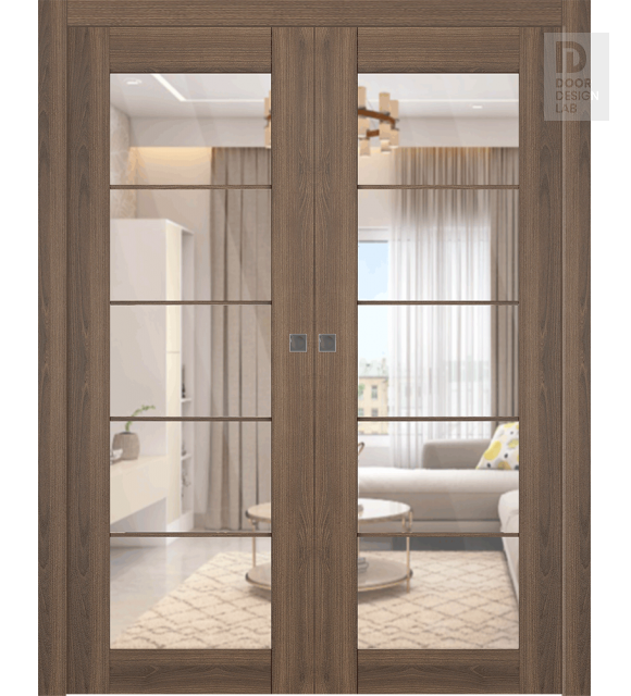 Avon 5 Lite Clear Vetro Pecan Nutwood Modern Interior Double Pocket Doors by Belldinni