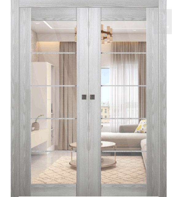 Avon 5 Lite Clear Vetro Ribeira Ash Modern Interior Double Pocket Doors by Belldinni