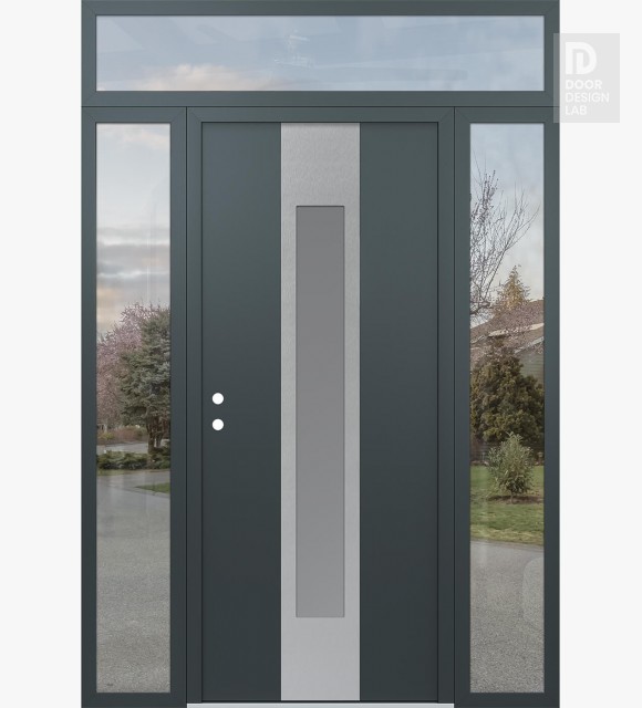 Modern Steel Front Door DIAMOND A1 60" X 96" ANTHRACITE/ANTHRACITE FROSTED GLASS PANEL STAINLESS STEEL LHI WITH 2 SIDELITES AND TRANSOM CLEAR GLASS