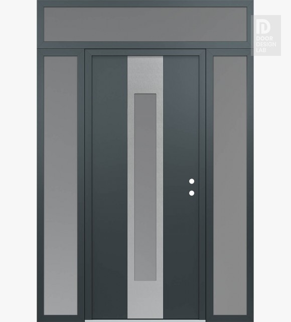 Modern Steel Front Door DIAMOND A1 60" X 96" ANTHRACITE/ANTHRACITE FROSTED GLASS PANEL STAINLESS STEEL RHI WITH 2 SIDELITES AND TRANSOM FROSTED GLASS