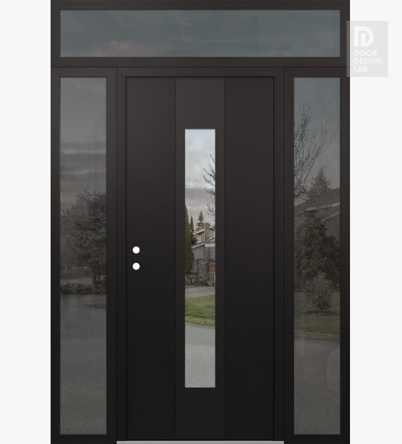 Modern Steel Front Door DIAMOND A1 64" X 96" BLACK/BLACK CLEAR GLASS PANEL BLACK LHI WITH 2 SIDELITES AND TRANSOM MIRRORED GLASS