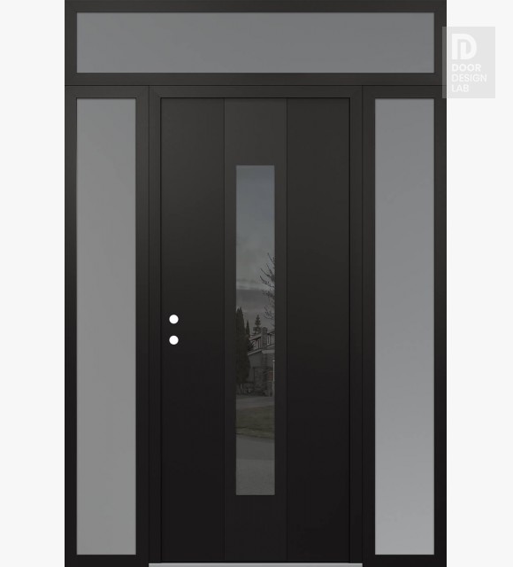 Modern Steel Front Door DIAMOND A1 64" X 96" BLACK/BLACK MIRRORED GLASS PANEL BLACK LHI WITH 2 SIDELITES AND TRANSOM FROSTED GLASS