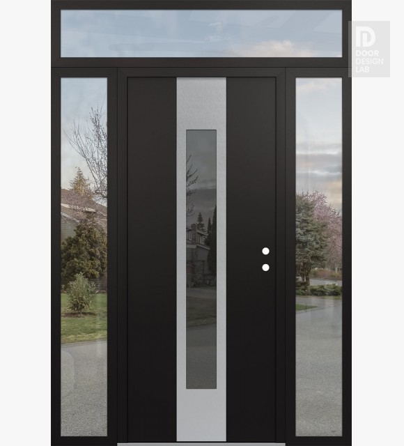 Modern Steel Front Door DIAMOND A1 64" X 96" BLACK/BLACK MIRRORED GLASS PANEL STAINLESS STEEL RHI WITH 2 SIDELITES AND TRANSOM CLEAR GLASS