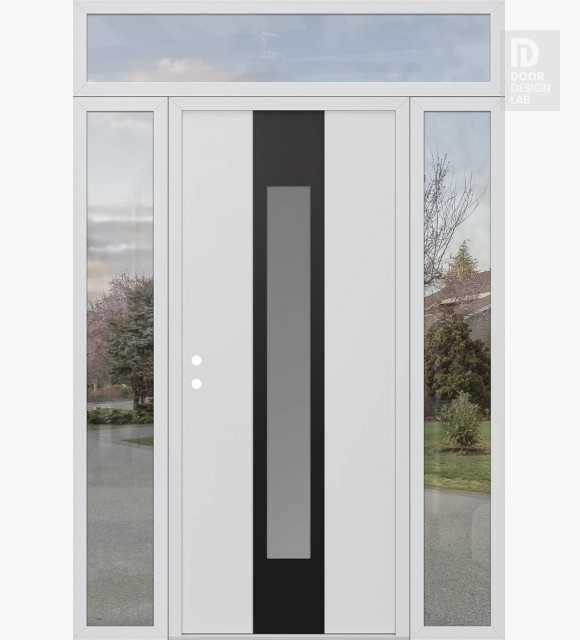Modern Steel Front Door DIAMOND A1 64" X 96" BLACK/WHITE FROSTED GLASS PANEL BLACK LHI WITH 2 SIDELITES AND TRANSOM CLEAR GLASS
