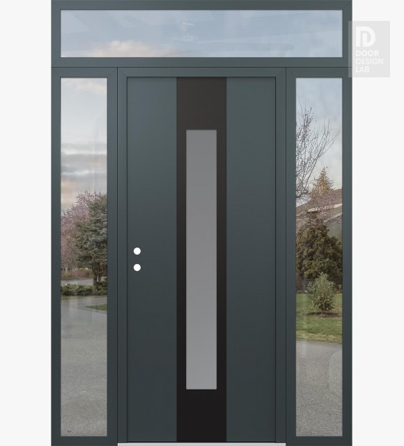 Modern Steel Front Door DIAMOND A1 68" X 96" ANTHRACITE/ANTHRACITE FROSTED GLASS PANEL BLACK LHI WITH 2 SIDELITES AND TRANSOM CLEAR GLASS