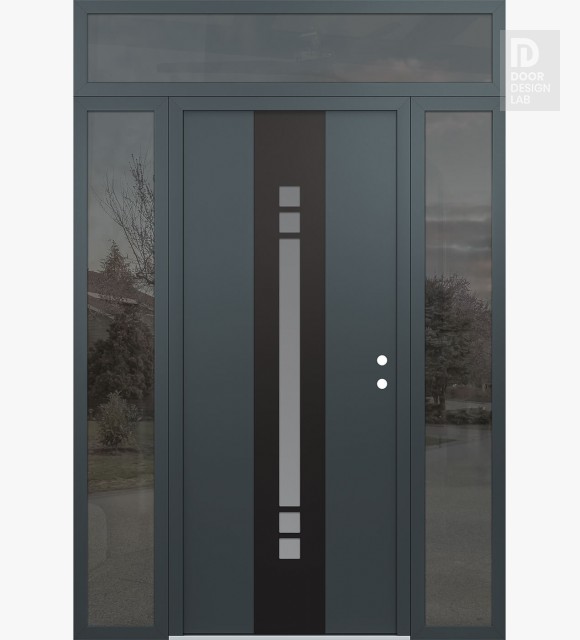 Modern Steel Front Door DIAMOND A4 60" X 96" ANTHRACITE/ANTHRACITE FROSTED GLASS PANEL BLACK RHI WITH 2 SIDELITES AND TRANSOM MIRRORED GLASS
