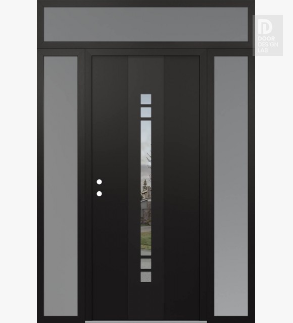 Modern Steel Front Door DIAMOND A4 60" X 96" BLACK/BLACK CLEAR GLASS PANEL BLACK LHI WITH 2 SIDELITES AND TRANSOM FROSTED GLASS