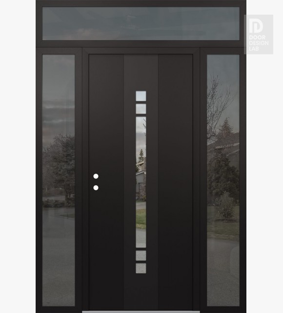 Modern Steel Front Door DIAMOND A4 60" X 96" BLACK/BLACK CLEAR GLASS PANEL BLACK LHI WITH 2 SIDELITES AND TRANSOM MIRRORED GLASS