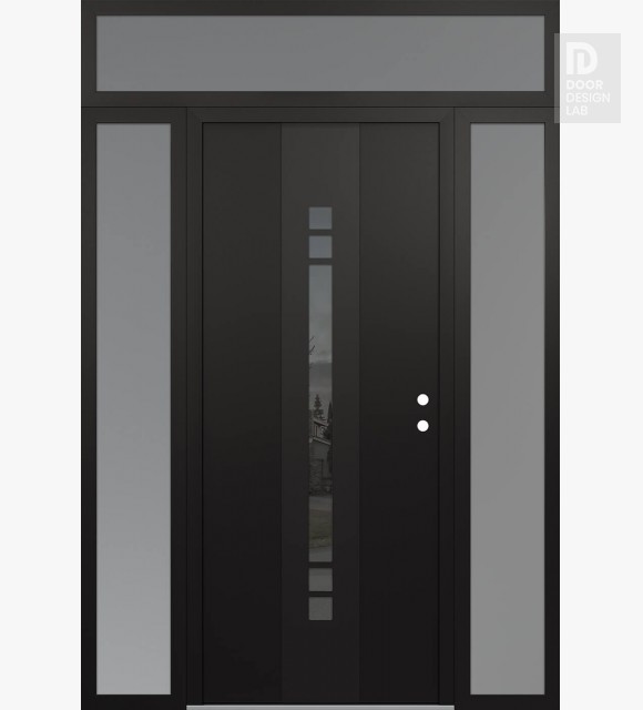 Modern Steel Front Door DIAMOND A4 60" X 96" BLACK/BLACK MIRRORED GLASS PANEL BLACK RHI WITH 2 SIDELITES AND TRANSOM FROSTED GLASS