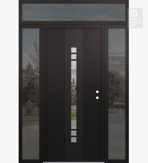 Modern Steel Front Door DIAMOND A4 64" X 96" BLACK/BLACK CLEAR GLASS PANEL BLACK RHI WITH 2 SIDELITES AND TRANSOM MIRRORED GLASS