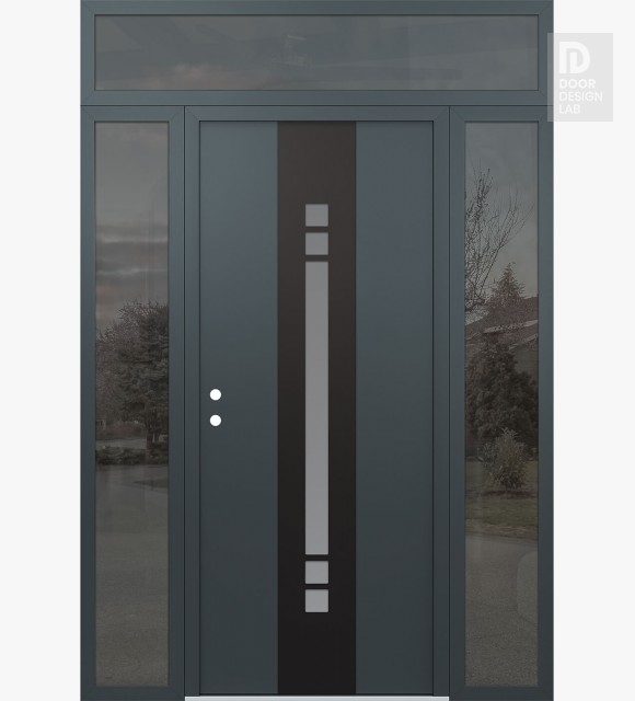 Modern Steel Front Door DIAMOND A4 68" X 96" ANTHRACITE/ANTHRACITE FROSTED GLASS PANEL BLACK LHI WITH 2 SIDELITES AND TRANSOM MIRRORED GLASS