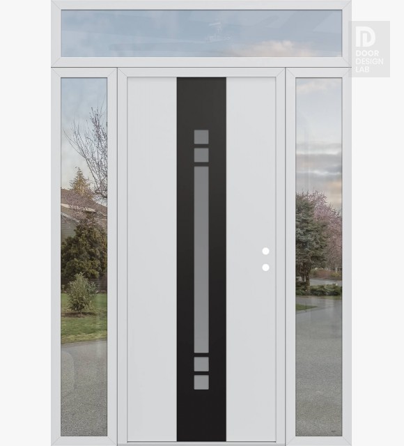 Modern Steel Front Door DIAMOND A4 68" X 96" BLACK/WHITE FROSTED GLASS PANEL BLACK RHI WITH 2 SIDELITES AND TRANSOM CLEAR GLASS