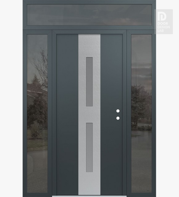 Modern Steel Front Door DIAMOND A6 60" X 96" ANTHRACITE/ANTHRACITE FROSTED GLASS PANEL STAINLESS STEEL RHI WITH 2 SIDELITES AND TRANSOM MIRRORED GLASS