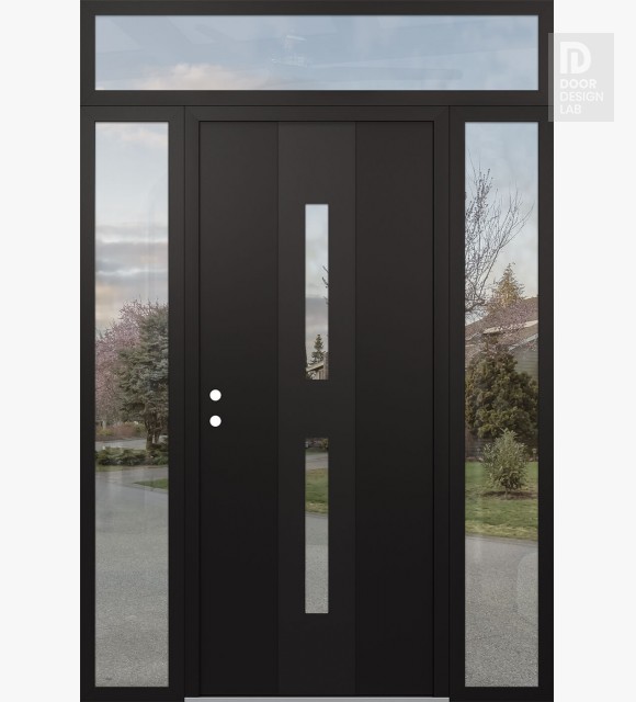 Modern Steel Front Door DIAMOND A6 60" X 96" BLACK/BLACK CLEAR GLASS PANEL BLACK LHI WITH 2 SIDELITES AND TRANSOM CLEAR GLASS