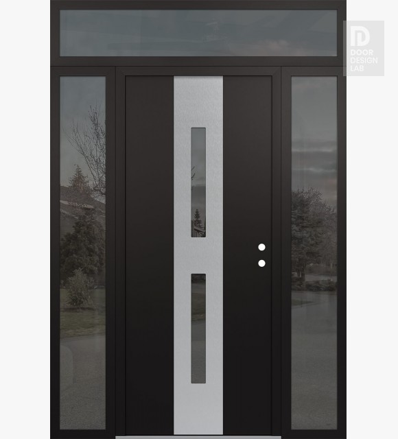 Modern Steel Front Door DIAMOND A6 60" X 96" BLACK/BLACK MIRRORED GLASS PANEL STAINLESS STEEL RHI WITH 2 SIDELITES AND TRANSOM MIRRORED GLASS