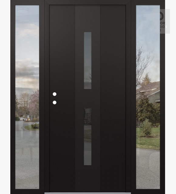 Modern Steel Front Door DIAMOND A6 64" X 80" BLACK/BLACK MIRRORED GLASS PANEL BLACK LHI WITH 2 SIDELITES CLEAR GLASS
