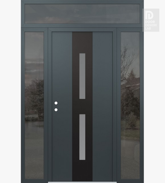 Modern Steel Front Door DIAMOND A6 64" X 96" ANTHRACITE/ANTHRACITE FROSTED GLASS PANEL BLACK LHI WITH 2 SIDELITES AND TRANSOM MIRRORED GLASS