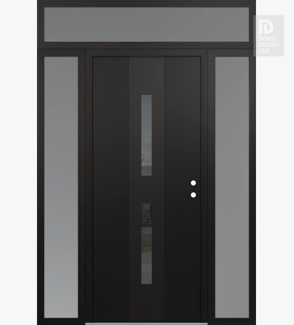 Modern Steel Front Door DIAMOND A6 64" X 96" BLACK/BLACK MIRRORED GLASS PANEL BLACK RHI WITH 2 SIDELITES AND TRANSOM FROSTED GLASS
