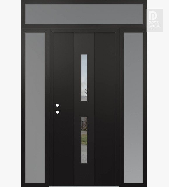 Modern Steel Front Door DIAMOND A6 68" X 96" BLACK/BLACK CLEAR GLASS PANEL BLACK LHI WITH 2 SIDELITES AND TRANSOM FROSTED GLASS