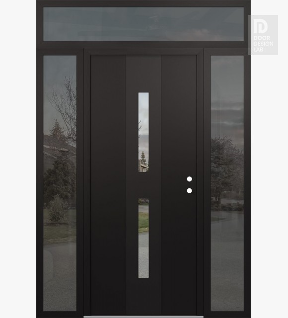 Modern Steel Front Door DIAMOND A6 68" X 96" BLACK/BLACK CLEAR GLASS PANEL BLACK RHI WITH 2 SIDELITES AND TRANSOM MIRRORED GLASS