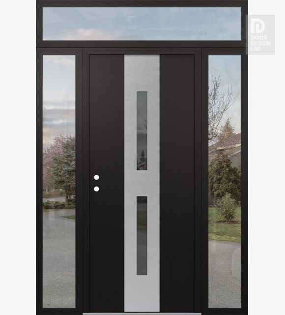 Modern Steel Front Door DIAMOND A6 68" X 96" BLACK/BLACK MIRRORED GLASS PANEL STAINLESS STEEL LHI WITH 2 SIDELITES AND TRANSOM CLEAR GLASS