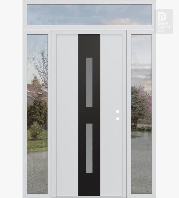 Modern Steel Front Door DIAMOND A6 68" X 96" BLACK/WHITE FROSTED GLASS PANEL BLACK RHI WITH 2 SIDELITES AND TRANSOM CLEAR GLASS