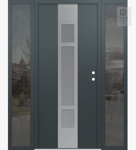 Modern Steel Front Door DIAMOND A9 60" X 80" ANTHRACITE/ANTHRACITE FROSTED GLASS PANEL STAINLESS STEEL RHI WITH 2 SIDELITES MIRRORED GLASS