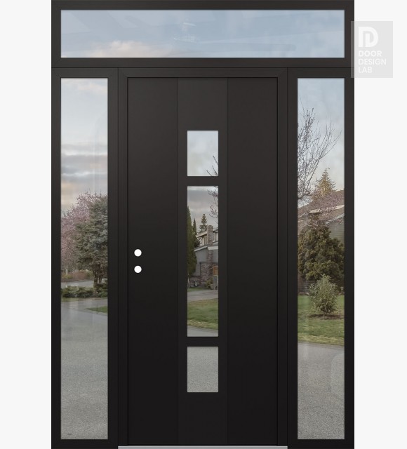 Modern Steel Front Door DIAMOND A9 60" X 96" BLACK/BLACK CLEAR GLASS PANEL BLACK LHI WITH 2 SIDELITES AND TRANSOM CLEAR GLASS