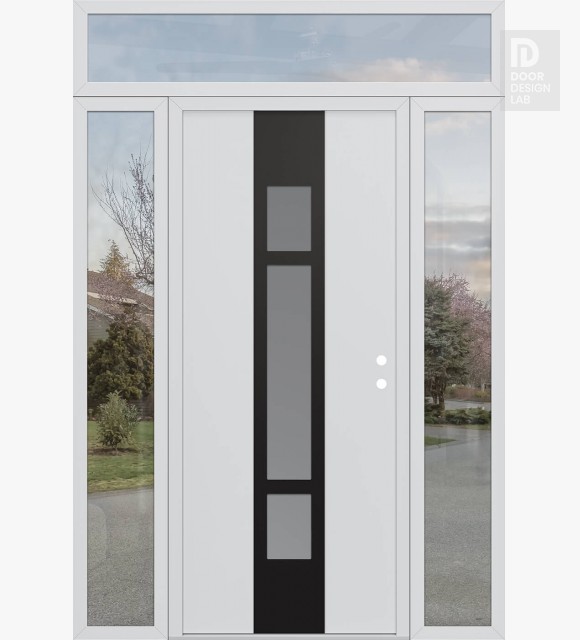Modern Steel Front Door DIAMOND A9 60" X 96" BLACK/WHITE FROSTED GLASS PANEL BLACK RHI WITH 2 SIDELITES AND TRANSOM CLEAR GLASS