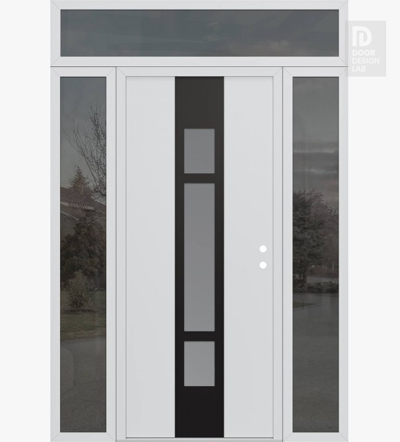 Modern Steel Front Door DIAMOND A9 60" X 96" BLACK/WHITE FROSTED GLASS PANEL BLACK RHI WITH 2 SIDELITES AND TRANSOM MIRRORED GLASS