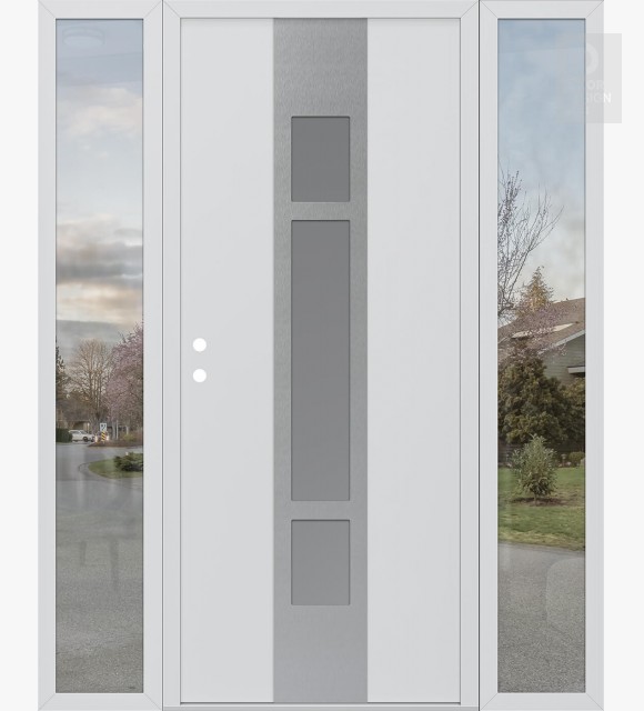 Modern Steel Front Door DIAMOND A9 64" X 80" BLACK/WHITE FROSTED GLASS PANEL STAINLESS STEEL LHI WITH 2 SIDELITES CLEAR GLASS