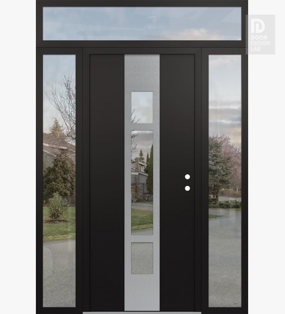 Modern Steel Front Door DIAMOND A9 64" X 96" BLACK/BLACK CLEAR GLASS PANEL STAINLESS STEEL RHI WITH 2 SIDELITES AND TRANSOM CLEAR GLASS