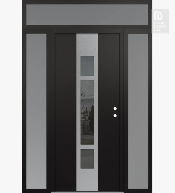Modern Steel Front Door DIAMOND A9 64" X 96" BLACK/BLACK MIRRORED GLASS PANEL STAINLESS STEEL RHI WITH 2 SIDELITES AND TRANSOM FROSTED GLASS