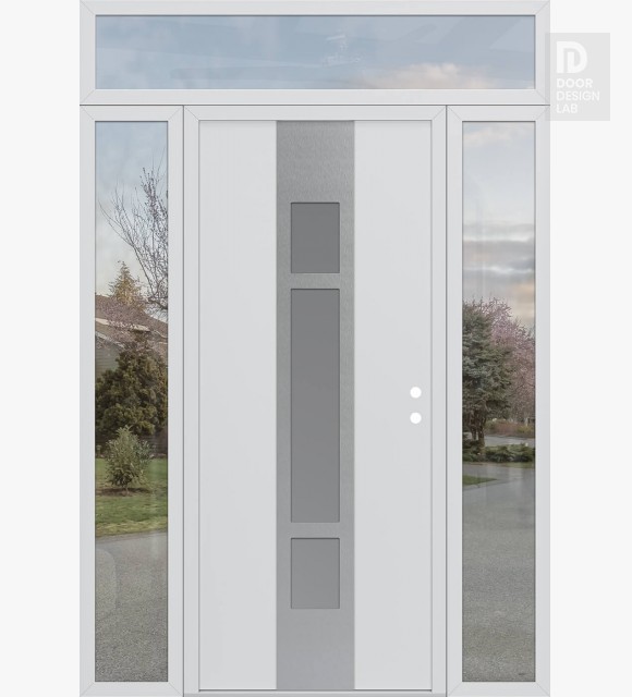Modern Steel Front Door DIAMOND A9 64" X 96" BLACK/WHITE FROSTED GLASS PANEL STAINLESS STEEL RHI WITH 2 SIDELITES AND TRANSOM CLEAR GLASS