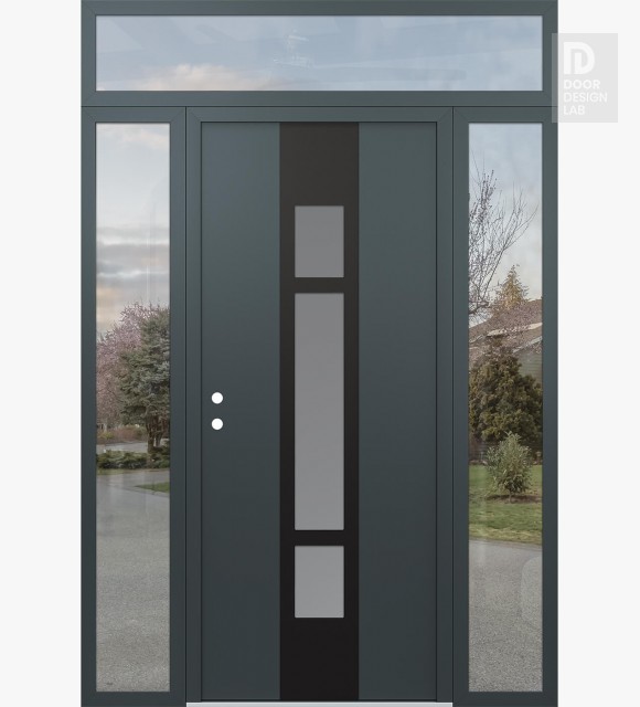Modern Steel Front Door DIAMOND A9 68" X 96" ANTHRACITE/ANTHRACITE FROSTED GLASS PANEL BLACK LHI WITH 2 SIDELITES AND TRANSOM CLEAR GLASS