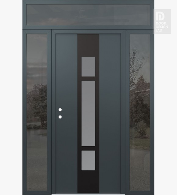 Modern Steel Front Door DIAMOND A9 68" X 96" ANTHRACITE/ANTHRACITE FROSTED GLASS PANEL BLACK LHI WITH 2 SIDELITES AND TRANSOM MIRRORED GLASS