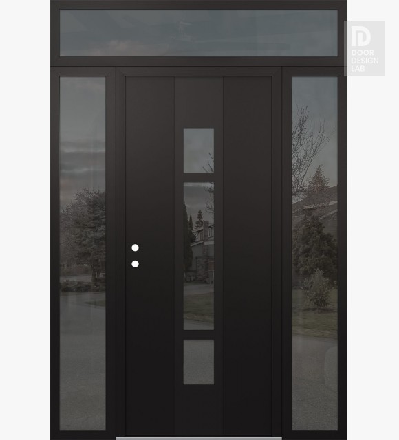 Modern Steel Front Door DIAMOND A9 68" X 96" BLACK/BLACK MIRRORED GLASS PANEL BLACK LHI WITH 2 SIDELITES AND TRANSOM MIRRORED GLASS