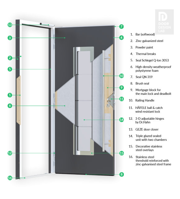 • Two thermal breaks, high-density polystyrene foam, and a glued laminated bar provide thermal insulation.
