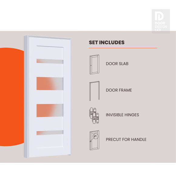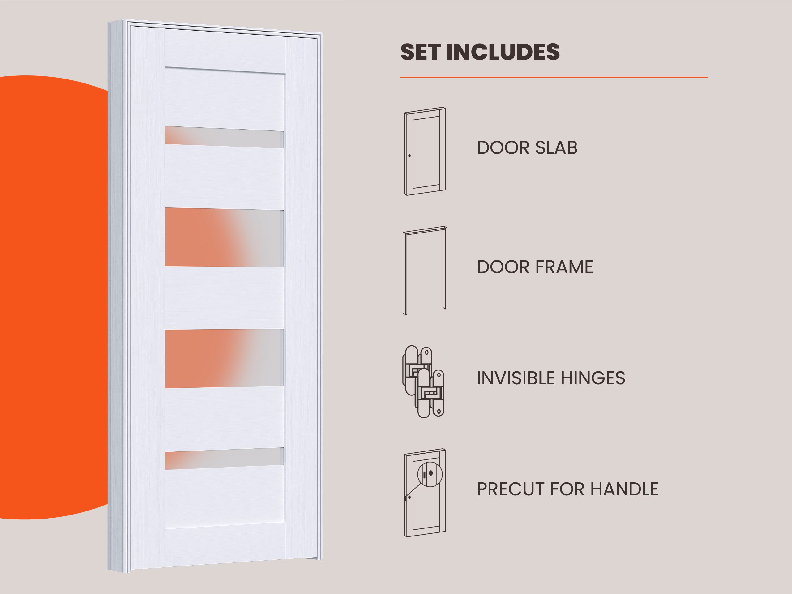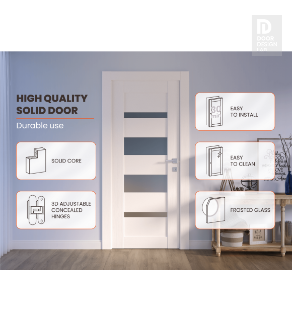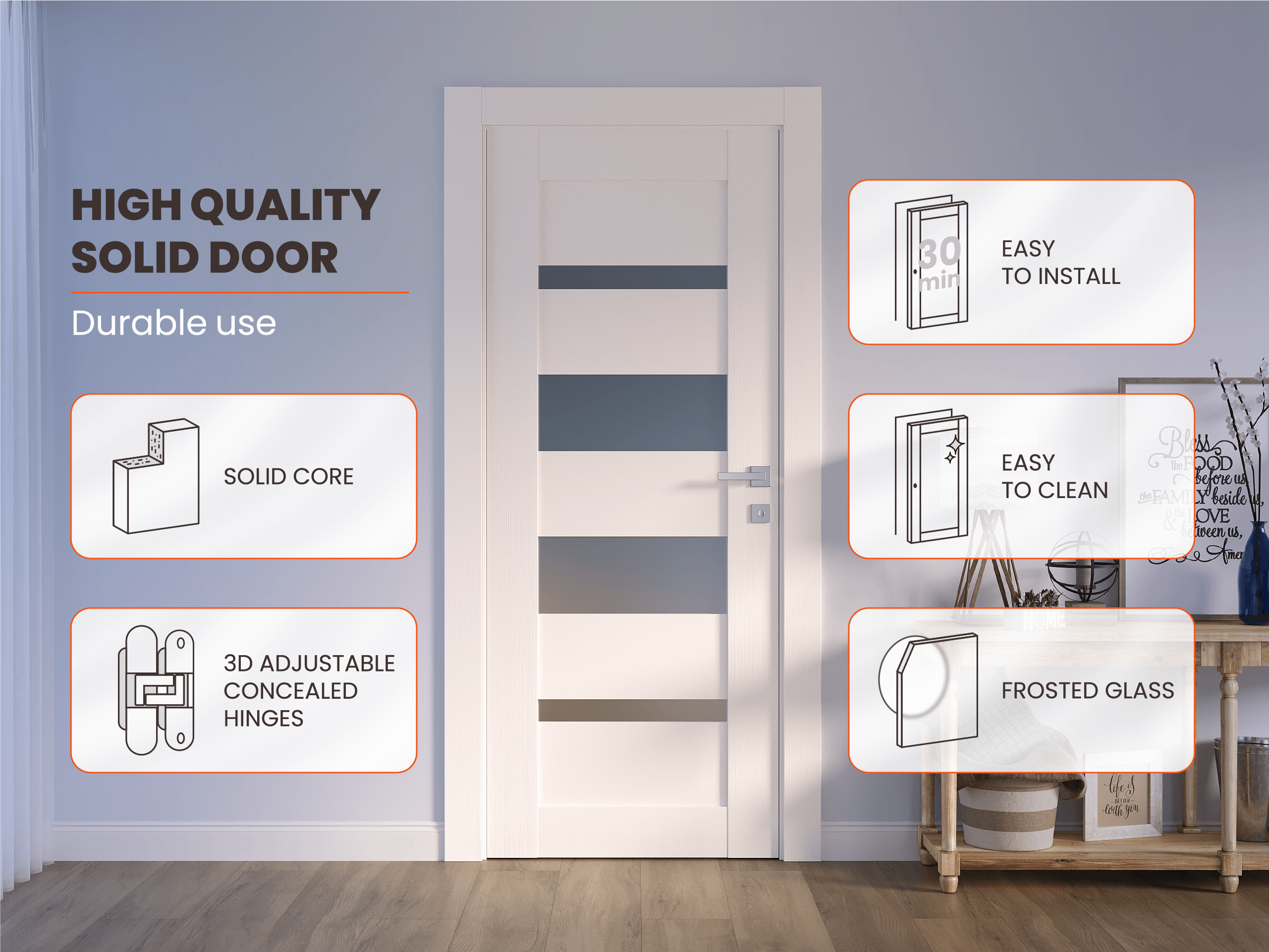 A DIY FRIENDLY pre-finished door. Mirella is an interior door that features a bright contemporary design and creates a light and spacious feeling in any room. Door design provides 5 square panels alternated with 4-lites of different width. The main decoration of this door model is 2 central lites of 9-1/8 in. W. Additional 2-lites of 2-3/4 in. W create a splendid modern style. The style of glass is white frosted with decorative translucent frost. It allows light to filter into the room and guarantees your privacy. The door construction is strengthened by engineered vertical stiles and horizontal rails to create a strong and sturdy door. Stiles and rails are crafted from engineered solid core that saves the privacy inside the room due to soundproof features, without weighting the slab. The door is supplied pre-finished with polypropylene (PP). This eco-friendly, scratch-resistant and moisture-resistant finish makes this door an ideal choice.